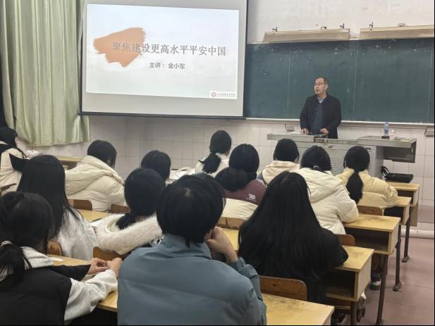 课堂上,金小军围绕二十届四中全会精神,紧扣总体国家安全观的核心内涵,以身边的网络安全、治安安全等实例为切入点,从“发展之基、成果亮眼、总体谋划”三个维度系统阐述了建设更高水平平安中国的重大意义、显著成效和战略部署。他教育同学们要深刻认识到平安不仅是国家发展的基石,更是每个人幸福生活的前提,并鼓励大家要树立“大安全”观念,在学习和生活中时刻保持清醒头脑,自觉成为国家安全的坚定维护者和积极践行者。