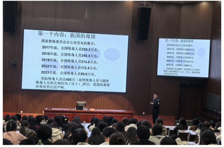 在行政楼第二报告厅专题教育现场,由强戒所管理科科长陈惠芳开展了以“远离毒品 珍惜生命”为主题的毒品预防知识讲座,九江市强制戒毒所二级高级警长吕任奎、教育矫治大队大队长徐东涛,马克思主义学院党总支副书记熊晓兰等参加。讲座由熊晓兰主持,经济贸易学院部分专业同学近200人参加此次讲座。